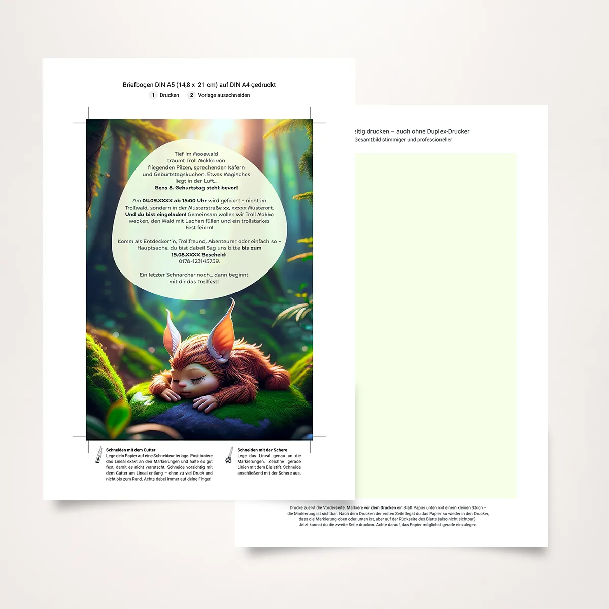Trollstarker Geburtstag voraus! Magische Einladung zum Kindergeburtstag – digital, kreativ & ganz leicht anpassbar. Tauche ein in die geheimnisvolle Welt von Troll Mokko und lade mit dieser fantasievollen Briefbogen-Einladung zu einem unvergesslichen Geburtstag ein! Diese digitale Canva-Vorlage entführt kleine Gäste mitten in den Mooswald…
