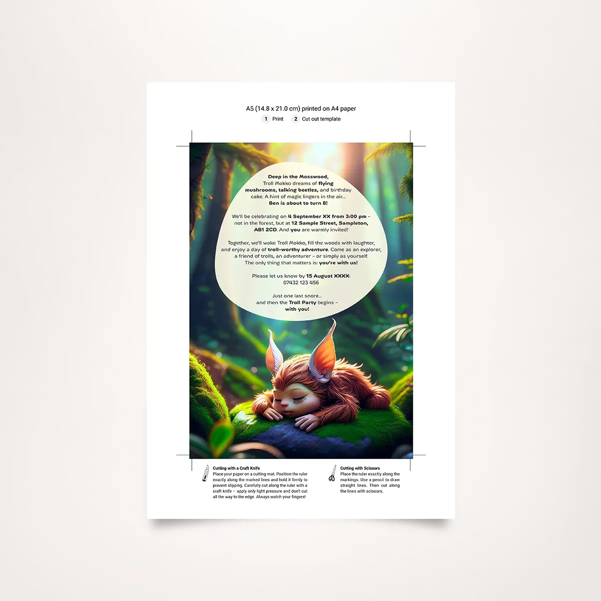 A troll-tastic birthday ahead! Magical invitation to a children’s birthday – digital, creative & very easy to customize. Immerse yourself in the mysterious world of Troll Mokko and invite guests to an unforgettable birthday with this imaginative stationery invitation! This digital Canva template transports little guests right into the mossy forest…