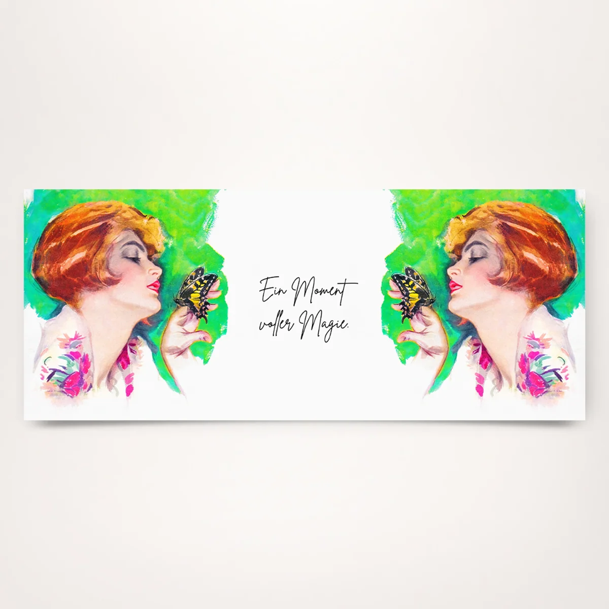Eine Frau, versunken in den Anblick eines Schmetterlings – zart, verträumt, zeitlos schön. Diese elegante Illustration, ursprünglich 1926 vom amerikanischen Künstler Harrison Fisher geschaffen, verleiht deiner Tasse nicht nur Stil, sondern auch einen Hauch nostalgischer Poesie.