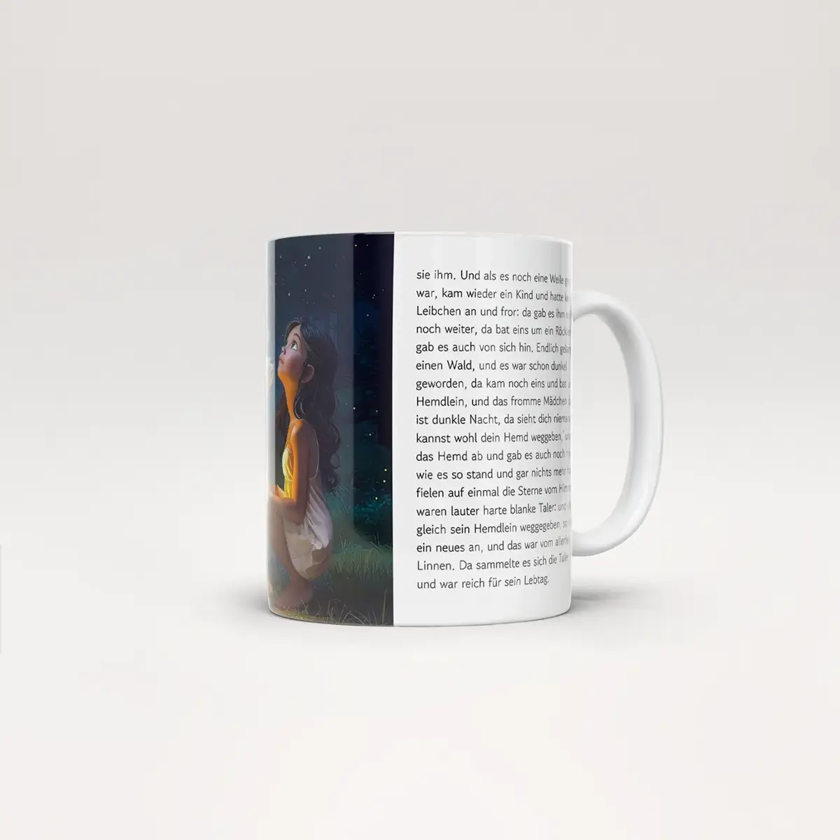 Links und rechts des Motivs steht das komplette Märchen „Die Sterntaler“ in der Originalfassung der Brüder Grimm – im authentischen, historischem Stil und mit all seinem poetischen Zauber. Wortwahl, Satzbau und Schreibweise entsprechen dem Original-Märchen. Eine Tasse, die nicht nur Kinderherzen berührt, sondern auch Erwachsenen ein Lächeln schenkt.